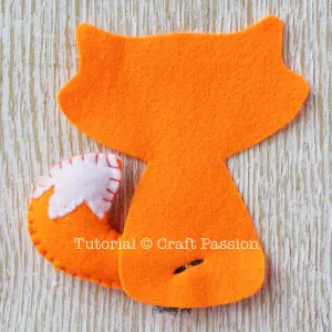 7. Place the front piece on the back piece with the wrong side facing each other, sew around with a blanket stitch. Leave a 1″ opening to the head of the fox.