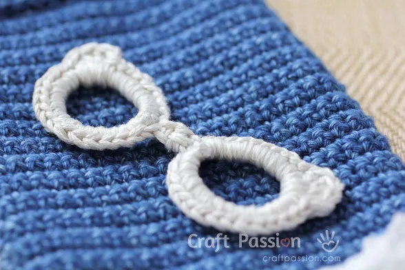The anchor crochet pattern is available above. It is made from 3 pieces of crochet work, the anchor body, the crossbar, and the bottom bar. They are sewn on the pouch by using a needle and thread.