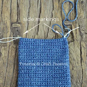 - Lay the pouch flat on the table, mark the side stitches at each side of the pouch. Both sides must have an equal number of stitches.