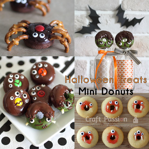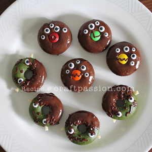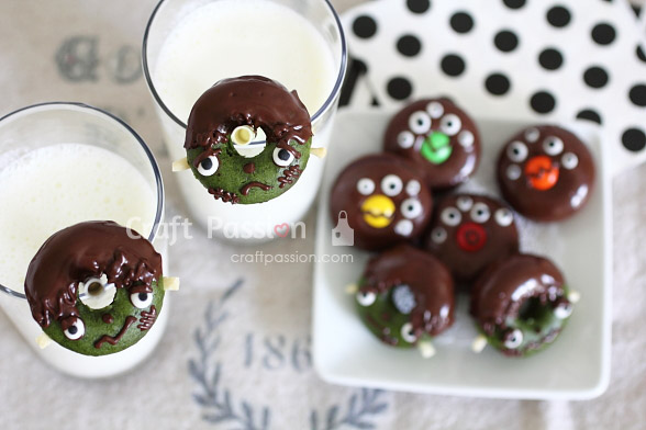 On top of the mini donut recipe, there are instructions on how to decorate these mini donuts into Frankenstein, multi-eyed monsters, spider, and bloody-mouth monsters or vampires.