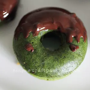 - To make Frankenstein, dip the matcha mini donuts into the melted chocolate to coat the front top part only.