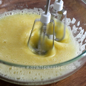 - In a large bowl, beat eggs lightly. Add sugar and continue to beat until foamy. Add vanilla and salt. Mix well. Scraping the sides at least once.