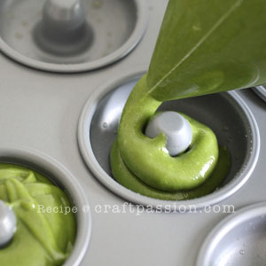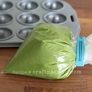 - Pour the batter into a piping bag. Fill each donut cavity until 80% full.