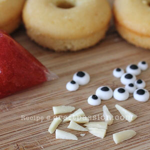 - Pipe some strawberry conserve on the edge of the donut hole, stick candy eyes, and almond silvers to make the Bloody Mouth Monster.