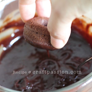 - Dip the entire front of the mini chocolate donut with melted chocolate.