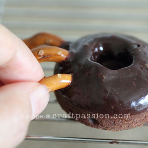 - Insert the pretzels to the edge of the donut. Be careful and don’t press it too hard to get into it too deep.