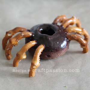 - Add candy eyes and red M&M chocolate candies to complete the spider donut.