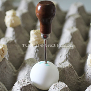 - Use an awl to make a hole in the ping pong ball. If you ping pong ball has printed label, punch the hole there.