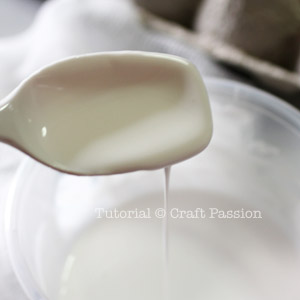 - Dilute about 2 to 3 tablespoons of Mod Podge or PVA craft glue to a runny consistency. Add a small amount of water at a time and stir well.