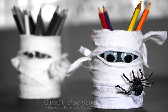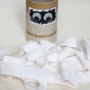This mummy holder is easy to make and kids can help in tearing the fabric into strips and wrapping it up. You can always adapt this method to wrap around a clean used food can or container.
