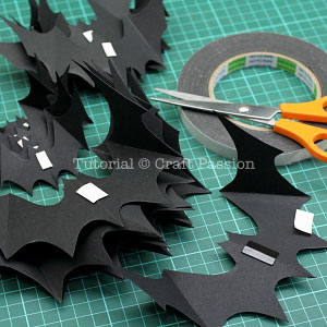 - Attach a small piece of double-sided tape at the center, remove the backing and stick the bats on the wall as they are swarming towards a direction.