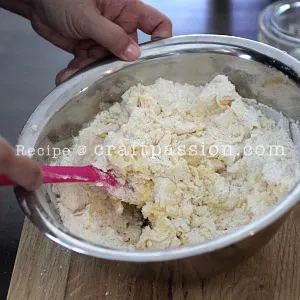 - Add the flour mixture into the butter mixture, mix again. Pour onto the tabletop, knead with your palms to form a dough.