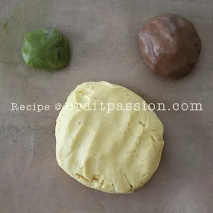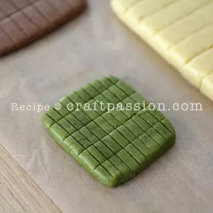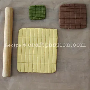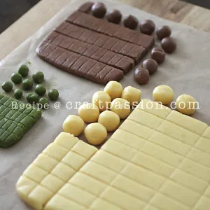 - Shape each colored dough (Brown and Green) into a square or rectangle, divide it into 50 small pieces. Cut and shape round. flatten slightly. Set aside.
