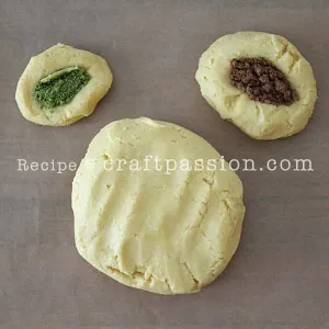 - Shape each colored dough (Brown and Green) into a square or rectangle, divide it into 50 small pieces. Cut and shape round. flatten slightly. Set aside.