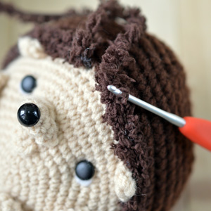 With dark brown fuzzy yarn and 2.5mm hook, surface crochet with sc onto the dark brown part of the body. Using fuzzy yarn means it’s okay to make a mistake since it won’t be immediately visible.