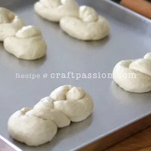 4. Divide the dough into 8 portions, cover and let rest at room temperature for about 10 to 15 minutes. Roll out and stretch the dough into long pieces with a rolling pin, then roll back into a cylinder. Roll and stretch the dough into a rope with both hands. Braid the ropes, pinching the ends and tuck them under to seal. Place the braids on a greased baking sheet. Space them at least 4″ apart. Cover them and leave them to rise for 50 minutes or until they are doubled in size. (Picture 9, 10, 11, 12, 13)