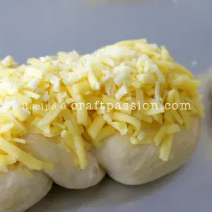 6. Lightly beat 1 egg to make egg-wash and brush on the dough. Sprinkle grated cheddar cheese on top. (Picture 14, 15)