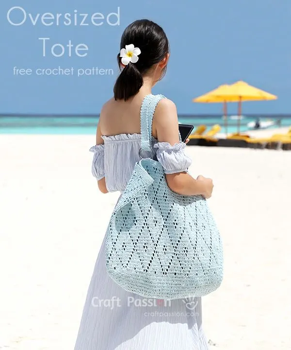 This blue beach tote is an oversized tote with a size of 21″ W x 29″ H (including shoulder straps). Crochet from raffia yarn and by using a 2.5mm crochet hook. The crochet pattern is easy and suitable for beginners with some crochet experiences.