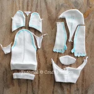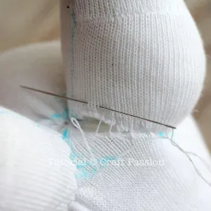 - Sew the sock according to the drawing line except for the head. Don’t sew on the folded edge, i.e. the sides of the socks.