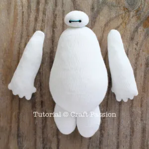 - Stuff the body with poly-fill stuffing. Focus on the tummy of Sock Baymax as he has a pear-shaped body with a big tummy. Massage and roll the body with your hand until you are satisfied with the amount of filling and shaping. Gather and sew to close the opening.