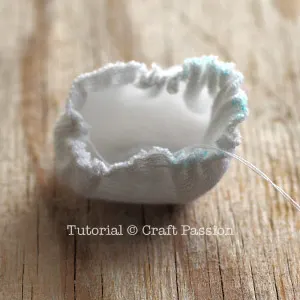 - Hand stitches the raw edge of the headpiece with running stitches. Pull the thread to gather the edge to make a cup.