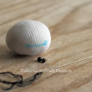 Mark the eyes position on the sock Baymax head, they are about 5/16″ apart. Sew the small domed button eyes on the 2 ends of the line and sew a black line between them with black embroidery floss.