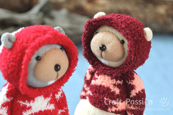 This hoodie sock beaver stands at about 9” tall and sewn from a set of star socks. Bob is a combination of 1 microfiber chenille sock (his hoodie) and 1 cotton sock (his body). His muzzle and teeth are sewn from felt, while his eyes and nose are buttons. You can find all these at the Craft Passion Shop