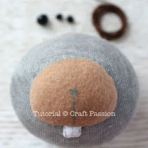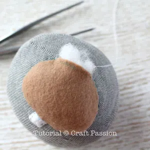 sew sock beaverProject a straight line from nose to eyes and extend it to the top of the head, this is the ear position. Pin and sew around the bottom of the ear to the head. Repeat the same to attach the other ear.