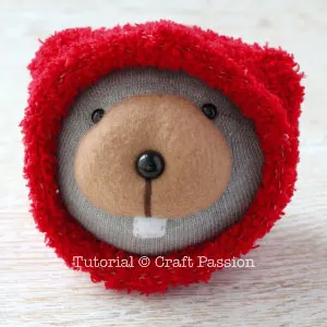 Sewing sock animal is so much fun, I can’t seem to stop myself. Meet the next sock animal in our Craft Passion family – Bob the sock beaver. This beaver soft toy comes with a hoodie (similar to the hoodie sock sheep and sock reindeer), which is detachable and yes, it can be pulled down as well.