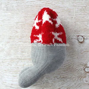 Pull the thread gently but firmly from the long thread loop, the sock will bump up and the “arm” of the sock beaver will form.