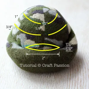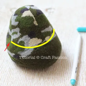 Draw a curved line as shown in the picture on the head, from one of the end of the top seam to another, with the center touching the heel line of the socks.