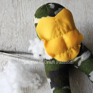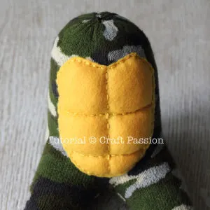 Position and place the yellow bottom shell onto the chest of the Sock Ninja Turtle.