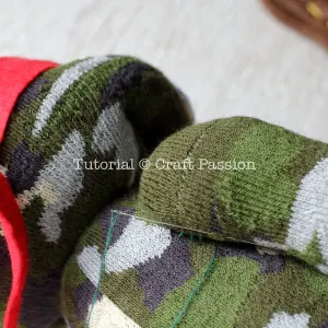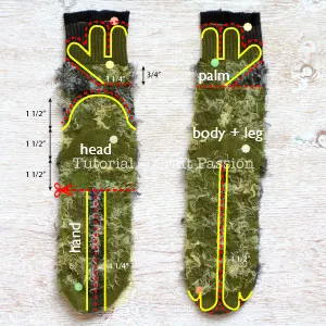 Machine-sew along the sketched sewing lines. Stretch the socks a little while sewing so that the sewing seam is stretchable during stuffing. You may hand-sew with backstitches.
