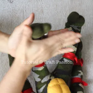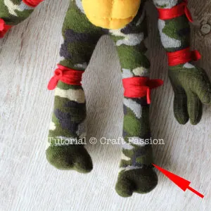 Tie the brown strips to the belly area to complete the Sock Ninja Turtle.
