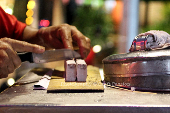 He inserted the wooden skewer into the rectangular-shaped popsicle. He told us that his fingers were crooked due to every day’s “ice poking” and not many people can stand the pain. {Think}… it is like poking a skewer into the stone-hard popsicle, maybe just a little softer than an ice cube.