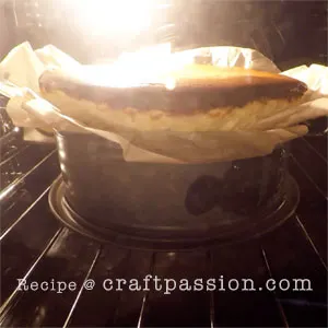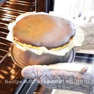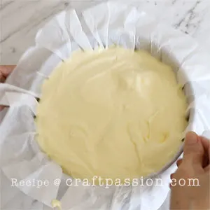 Line the 8″ springform pan with parchment paper, ensure that the paper extends about 2 inches above the rim of the pan with no overhand as the cake will rise above the rim in the oven. This also prevents your cake from sticking to the sides of the pan or the bottom of your pan. You can use a springfom pan in this cheesecake recipe as no water bath is required.