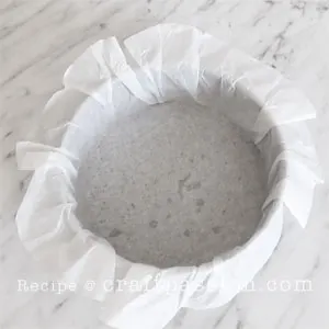 - Line the 8″ springform cake pan with parchment paper, ensure that the paper extends about 2 inches above the rim of the pan (the cake will rise above the rim in the oven).
