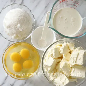 Cream cheese, heavy cream, and eggs have to be at room temperature. This extra step helps your ingredients to coalesce beautifully into a smooth, lump-free, clump-free cheesecake batter.
