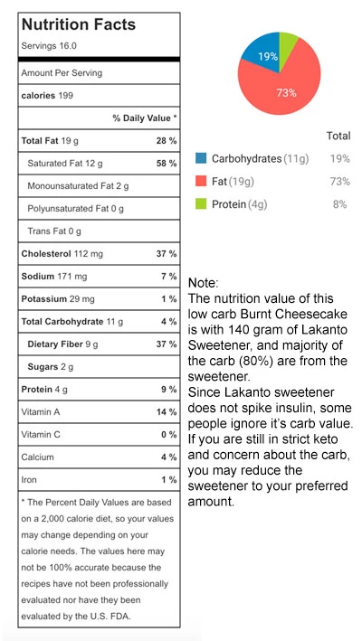 - Natural Low Carb Sweetener – Lakanto sweetener is monk fruit sweetener mixed with erythritol. It is natural, and most importantly, it does not raise blood glucose levels. Read more on Low Carb Sweetener and find one to replace if needed, there is a sweetener conversion chart under instructions, so you will know how much to use as a replacement for Lakanto. By the way, this recipe has not been tested with other sweeteners, so please use the replacement with cautious. If you are baking as “Gluten Free” Burnt Cheesecake and is not restricted to low carb, you may use the 170 gram of fine granulated sugar or castor sugar.