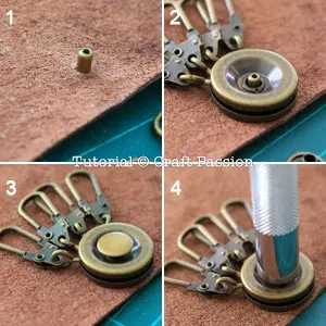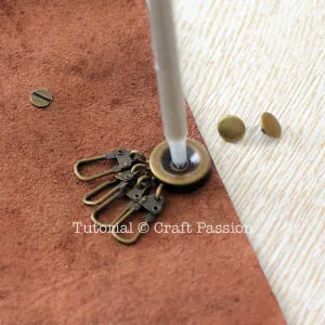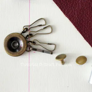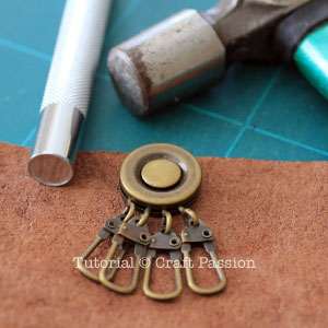 The keyholder bracket is fixed to the pouch by using a double cap rivet set hence there is no sewing needed too. I am using a round keyholder bracket which is uncommon in the market, but there are rectangle type which you can get it from some craft shops [Update: I have these 2 brackets in Craft Passion Shop, Round & Rectangle]. In order to further embellish the leather key pouch, you may add a small key charm to the front of the key pouch but it is absolutely optional.