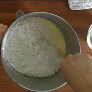 Remove from the water bath, sift cake flour and corn starch and fold into a mixture