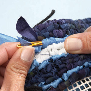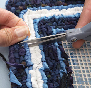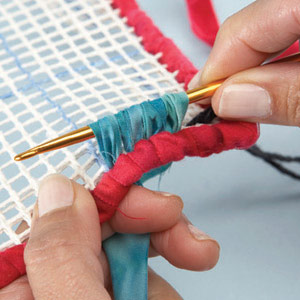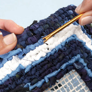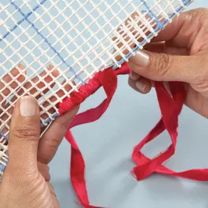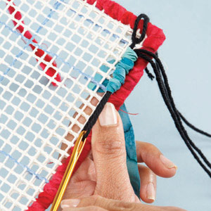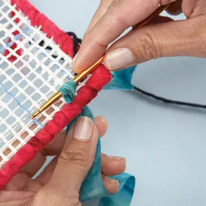 a. Once the pattern is locker hooked, begin finishing the design by sewing in tails.