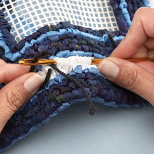 b. Change fabric strip colors or add more as needed to follow the pattern leaving a 2-inch tail with each new strip you use. Leave an unhooked area in the center for the tile as indicated by the pattern.