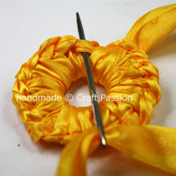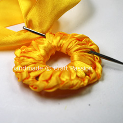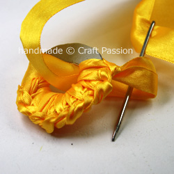 c. Sew the yellow ribbon as shown. It is similar to blanket stitches, where you insert the needle into the loop before pulling the ribbon.