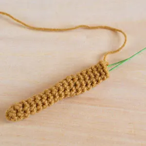 With a new strand of caramel cream yarn, thread it through a darning needle and bring it up to a spot below Round 6 of the head.