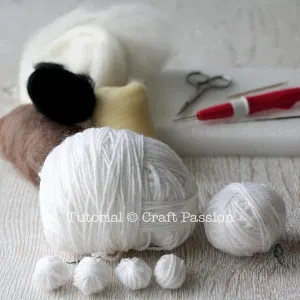 The sheep is constructed using rolled-up yarn balls as the sculptural core. The sculptural core is then wrapped by the wool followed by the needle felt. It saves up a lot of wool with this method. You may add a jingle bell in the body to make it rattle if you are making it as a toy for the kid.