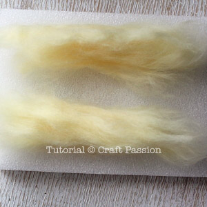- Pull about 3 inches of pastel yellow wool from the roving. Split it into 2 equal parts. These are for the horns of the sheep. If you are making a ewe / female sheep, omit the horns.