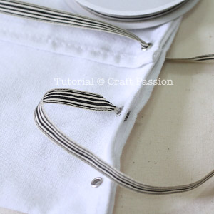 Insert the ribbon into the top eyelet and out from the bottom eyelet, start from the first eyelet of the tea towel (refer photo) which is now on the overlapping fold.