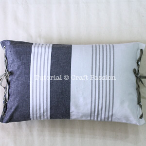 There could be some other techniques for no sew pillow, have been seeing some using fusible web to “glue” the edges, but I wonder if it is only for no wash pillow. Here, I am using “lace and fasten” method, by lacing through eyelets at the edges, draw the edges together and fasten them to form a pillow cover. When you are tired with the pillow, you can always take out the ribbon lacing and return the tea towel back to its original flat form.