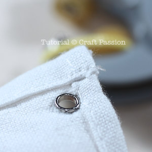 Fold the tea towel with 2 eyelets overlapping at the end edges. Align the eyelets in all layers.